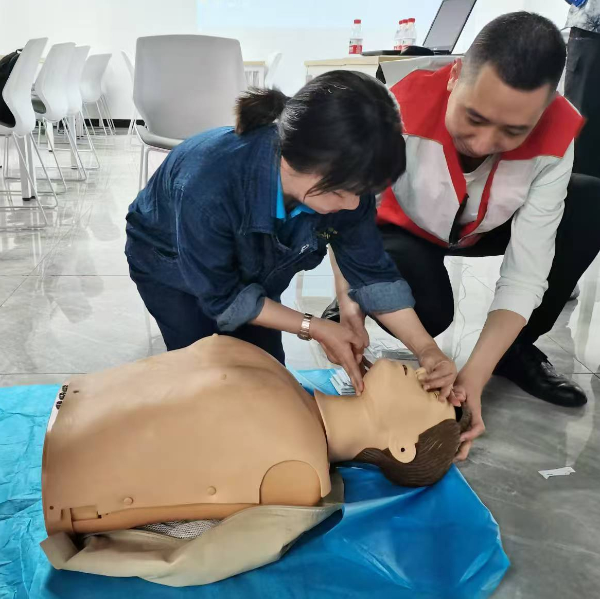 在心肺复苏培训环节,培训专家结合临床经验,详细讲解了判断心脏骤停的方法、胸外按压的位置、频率和深度以及人工呼吸的操作要点,并借助模拟人进行现场演示,让员工们对心肺复苏的操作有了更清晰的认识。随后,员工们积极参与实操,在专家的一对一指导下,逐步掌握了心肺复苏的正确操作流程,专家耐心纠正操作姿势,确保每位员工都能熟练掌握这一关键的急救技能。
